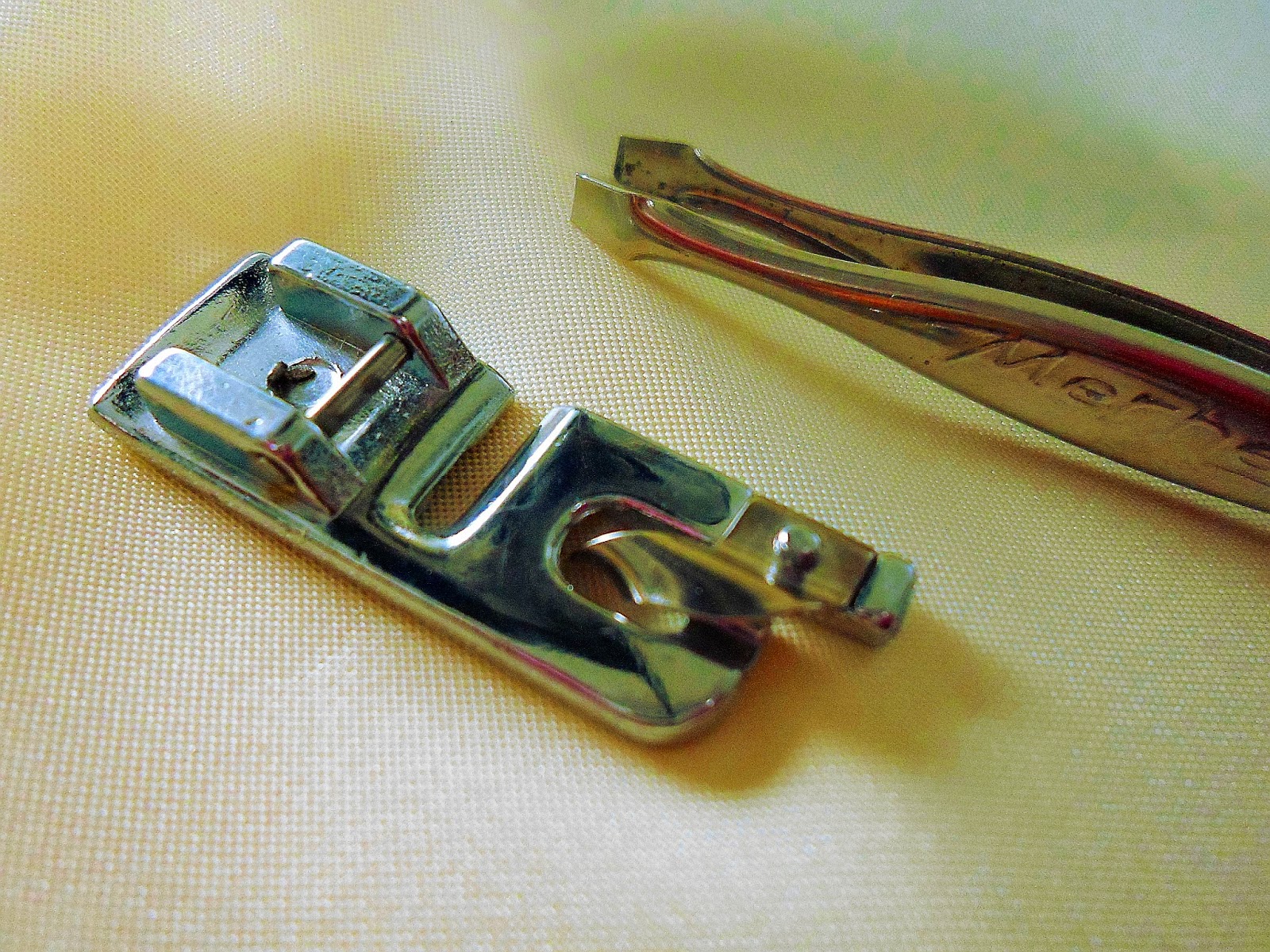 Se o tecido desfia com muita facilidade, faça a bainha no ponto Zig-Zag ao invés de ponto reto. A abertura no calcador - seta laranja - permite que a agulha se movimente em zig-zag sem o perigo de quebrar.